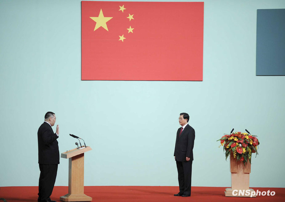 12月20日,慶祝澳門回歸祖國(guó)十周年大會(huì)暨澳門特別行政區(qū)第三屆政府就職典禮在澳門東亞運(yùn)動(dòng)會(huì)體育館舉行。澳門特區(qū)第三任行政長(zhǎng)官崔世安宣誓就職,國(guó)家主席胡錦濤監(jiān)誓。中新社記者 廖攀 攝