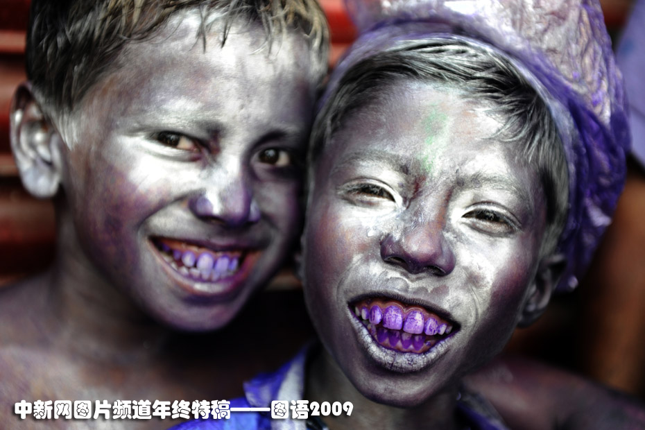 3月12日,印度青年身涂彩色粉末慶祝春天的到來(lái)。