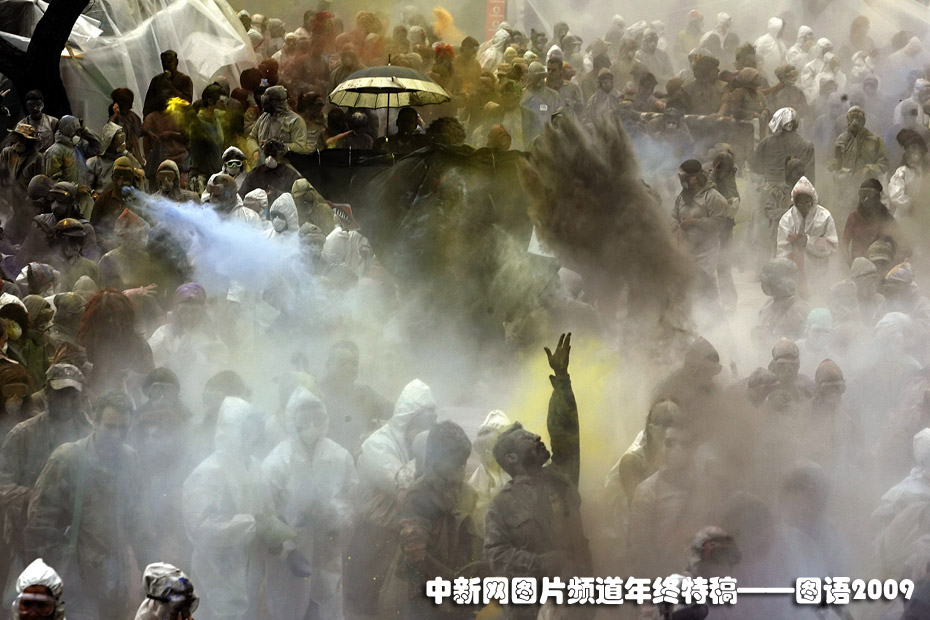 3月2日,人們在希臘雅典西北小城加拉希迪的街道上用加了各種天然顏料的面粉互相投撒,表達祝福。