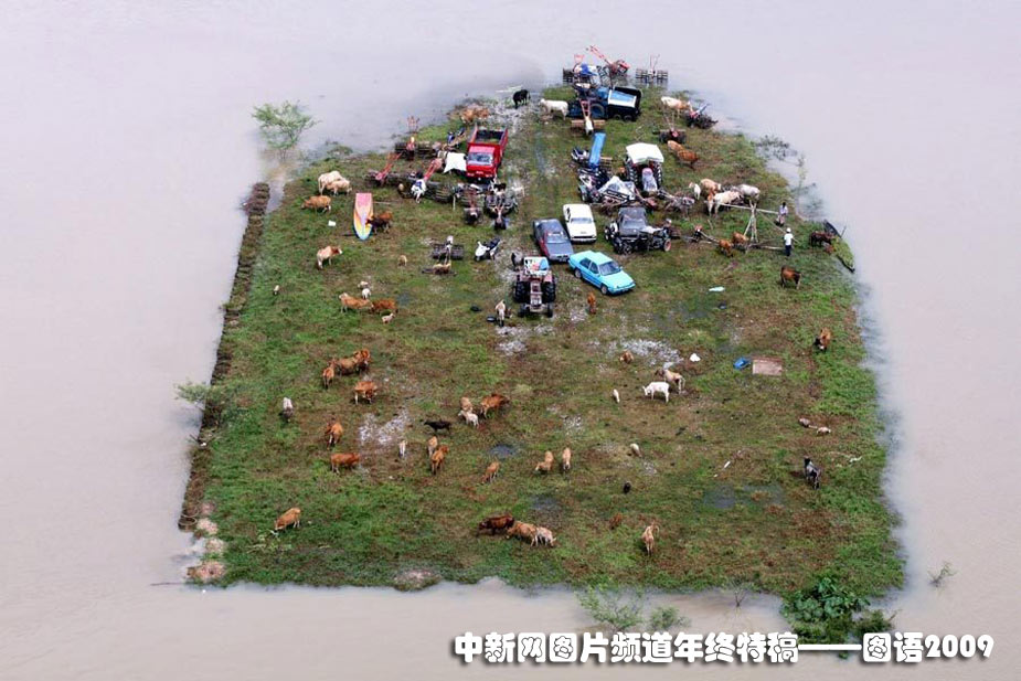 2009年11月8日,隨著雨季來臨,馬來西亞吉蘭丹州的杰拉珀登斯村莊發(fā)生洪水,數(shù)百名村民被撤離到這一地區(qū)。這張圖片是從空中拍攝的,可以看到被洪水圍困的奶牛和汽車。
