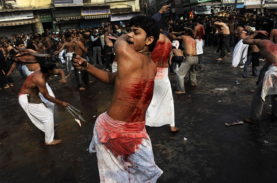12月28日,印度穆斯林慶祝阿舒拉節(jié)。一些當(dāng)?shù)啬滤沽衷趦x式上用鐵鞭抽打自己,以此慶祝節(jié)日。圖片來源:中國新聞網(wǎng)