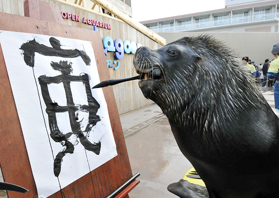 12月30日,日本神奈川八景島海洋樂園水族館內(nèi),海獅表演了用毛筆在紙上“寫”漢字的節(jié)目。圖片來源:中國新聞網(wǎng)