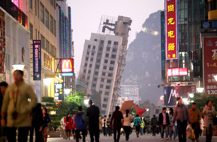 12月30日, 柳州,沒有倒下的半邊樓就像一座斜塔。12月30日下午,廣西柳州市柳江路一高層公寓將采用爆破方式實施整體拆除。這幢高層公寓總高22層、66.4米,總建筑面積16422平方米。由于該樓體量較大,為實施有效爆破,爆破公司在前期用控制藥量爆破的方式把整棟樓從中間“切開”,讓一棟樓變?yōu)椤皟蓷潯,再采用控制爆破時間的方式爆破。這是迄今廣西爆破拆除的最高的單體建筑。但爆破只造成了半棟建筑完全倒下,另一半在傾斜矗立著。顏篁/CFP