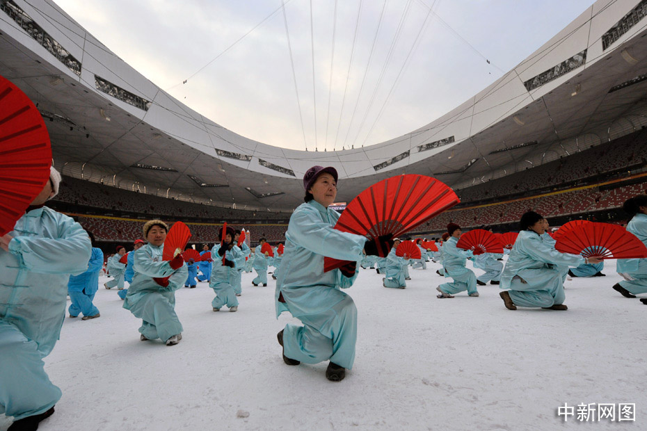 2010年1月1日上午,2010人在被冰雪覆蓋的鳥巢內(nèi)表演了太極拳、武功扇等民族傳統(tǒng)健身項(xiàng)目。中新網(wǎng)記者 金碩 攝