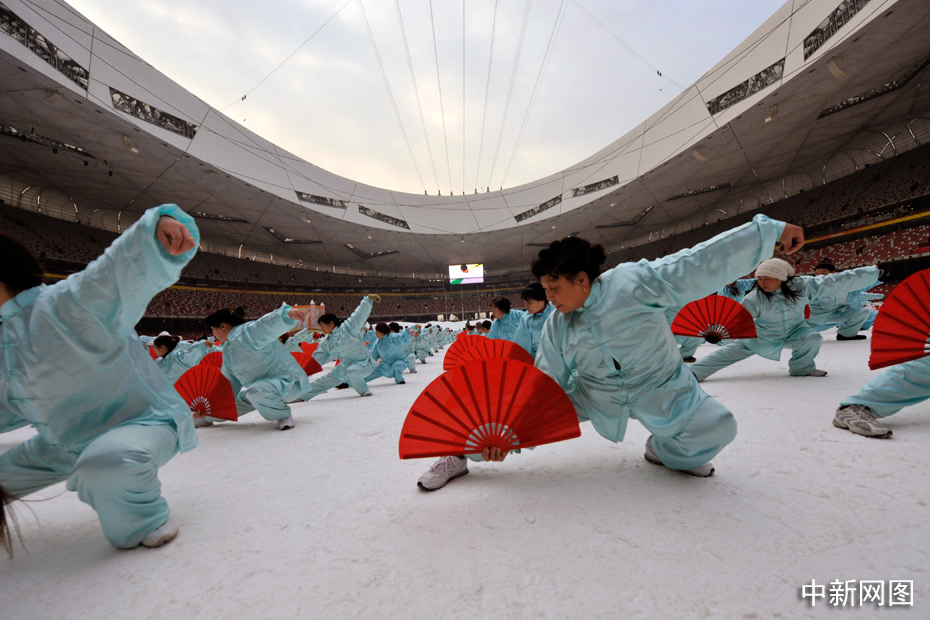 2010年1月1日上午,2010人在被冰雪覆蓋的鳥(niǎo)巢內(nèi)表演了太極拳、武功扇等民族傳統(tǒng)健身項(xiàng)目。中新網(wǎng)記者 金碩 攝