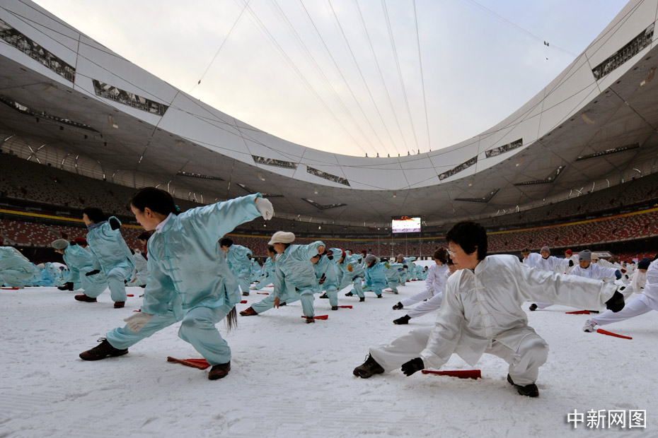 2010年1月1日上午,2010人在被冰雪覆蓋的鳥巢內(nèi)表演了太極拳、武功扇等民族傳統(tǒng)健身項(xiàng)目。中新網(wǎng)記者 金碩 攝