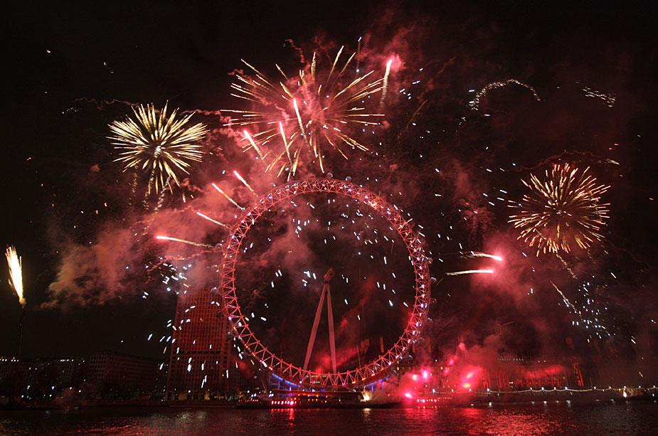 圖為2010年1月1日,位于英國(guó)倫敦的“倫敦眼”周邊燃放起了美麗的煙花。