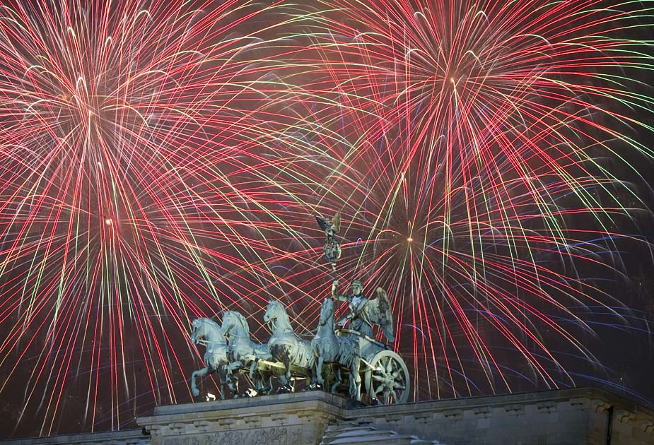 圖為2010年1月1日,焰火在德國(guó)柏林勃蘭登堡門(mén)上空綻放,慶祝新年的到來(lái)。