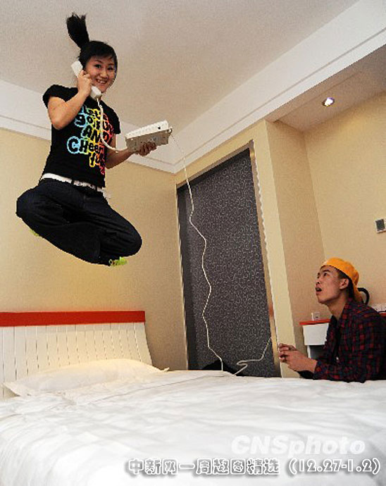 2009年12月26日,山東濰坊年輕人在濰坊一家酒店玩“跳床”。每當(dāng)周末,山東濰坊“跳床”愛(ài)好者就聚集起來(lái)玩“跳床”游戲,鍛煉身體,減輕工作壓力。據(jù)活動(dòng)組織者濰坊領(lǐng)航文化負(fù)責(zé)人孫志達(dá)講,“跳床”從國(guó)外流傳而來(lái),能達(dá)到鍛煉和減壓效果。目前,在國(guó)內(nèi)一些城市,“跳床”受到了越來(lái)越多人的歡迎。圖片來(lái)源:中國(guó)新聞網(wǎng)>>點(diǎn)擊觀看詳細(xì)內(nèi)容
