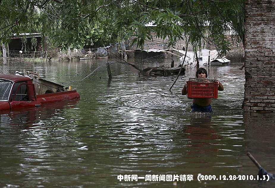 周一(28日)在阿根廷的圣安東尼.德.阿萊科,一名少年托著裝有鳥的籠子在洪水泛濫的街道行走。阿萊科河沿岸的洪水已造成至少兩人死亡,數(shù)千人被迫撤離。圖片來源:中國(guó)新聞網(wǎng)