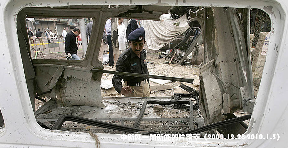 周一(28日),巴基斯坦卡拉奇發(fā)生一起自殺式爆炸襲擊事件。當?shù)鼐秸诓榭幢粨p壞的車輛。圖片來源:中國新聞網(wǎng)