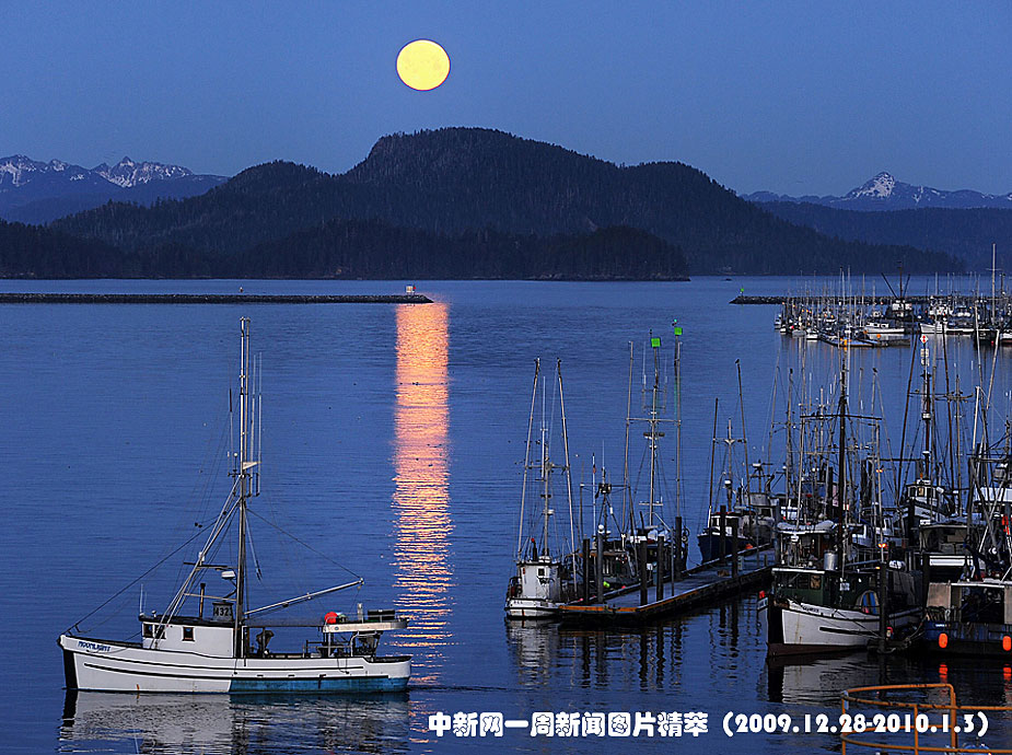 周五(1日),一輪明月照亮了北美阿拉斯加的港口。圖片來(lái)源:中國(guó)新聞網(wǎng)