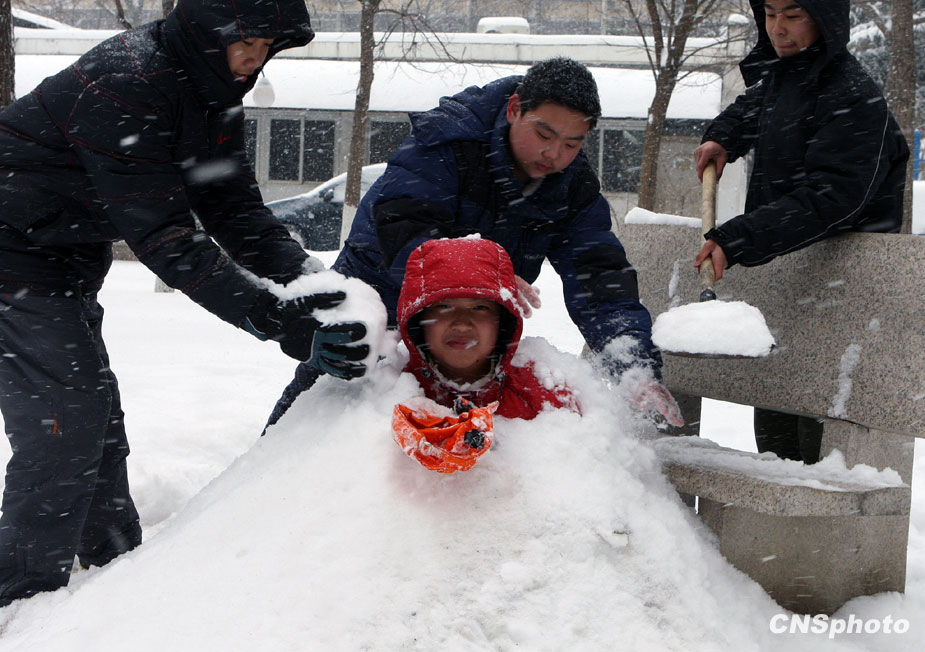 1月3日,幾名不畏嚴(yán)寒的中學(xué)生在雪中制作“活雪人”,樂(lè)在其中。中新社發(fā) 任晨鳴 攝