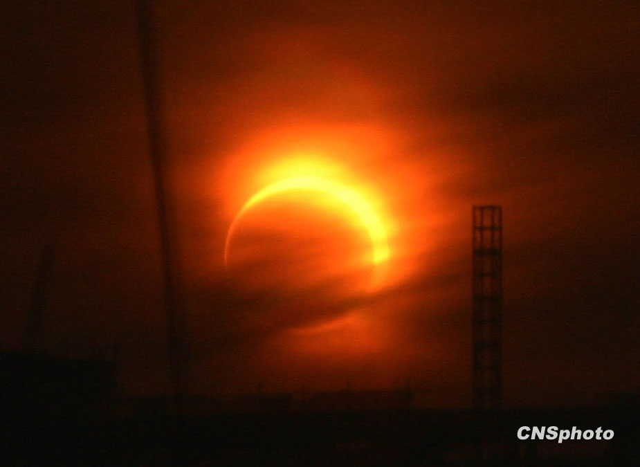 本世紀(jì)首場(chǎng),也是全球未來1000年內(nèi)環(huán)食持續(xù)時(shí)間最長的日環(huán)食1月15日劃過天際。日環(huán)食帶從印度洋經(jīng)過緬甸進(jìn)入中國國,由云南經(jīng)四川省的部分地區(qū),再穿過重慶市、湖北省西北部,直至華北地區(qū)。圖片來源:中國新聞網(wǎng)