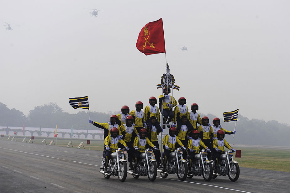 圖為印度士兵展示摩托車技巧。