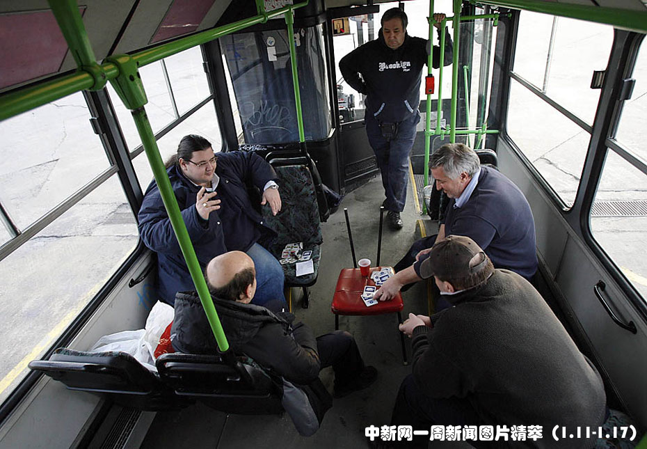 1月12日(周二),在布達佩斯一個汽車站,幾名司機在一輛城市公交車內(nèi)打牌。他們從周二開始罷工,要求提高工資并簽訂新的勞動合同。圖片來源:中國新聞網(wǎng)