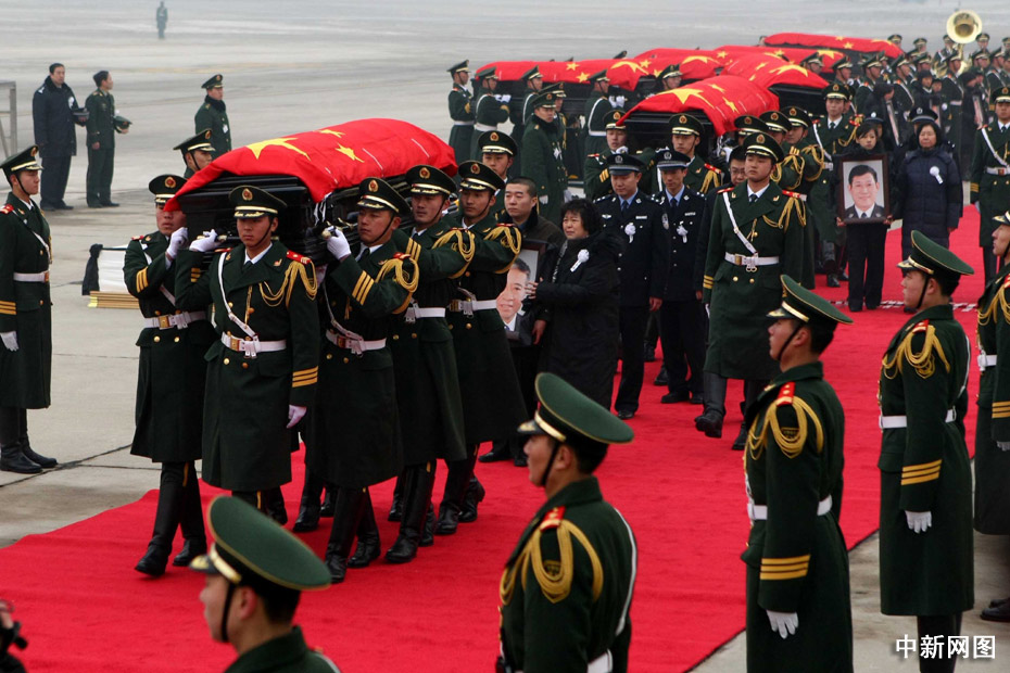 1月19日上午,在海地地震中犧牲的八位中國(guó)維和警察遺體回國(guó)接機(jī)儀式在北京首都機(jī)場(chǎng)舉行。中新社記者 富田 攝