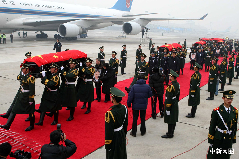 1月19日上午,在海地地震中犧牲的八位中國(guó)維和警察遺體回國(guó)接機(jī)儀式在北京首都機(jī)場(chǎng)舉行。中新社記者 富田 攝
