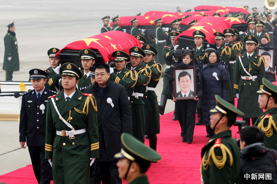 1月19日上午,在海地地震中犧牲的八位中國維和警察遺體回國接機儀式在北京首都機場舉行。中新社記者 富田 攝