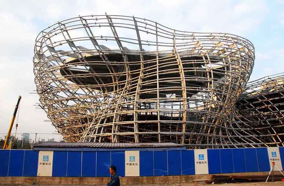 2010年1月21日上海迎來(lái)世博會(huì)開幕倒計(jì)時(shí)100天。世博會(huì)場(chǎng)館建設(shè)進(jìn)入最后沖刺階段,部分場(chǎng)館已形象初顯。圖為“藤條籃子”造型西班牙館。鈕一新/CFP