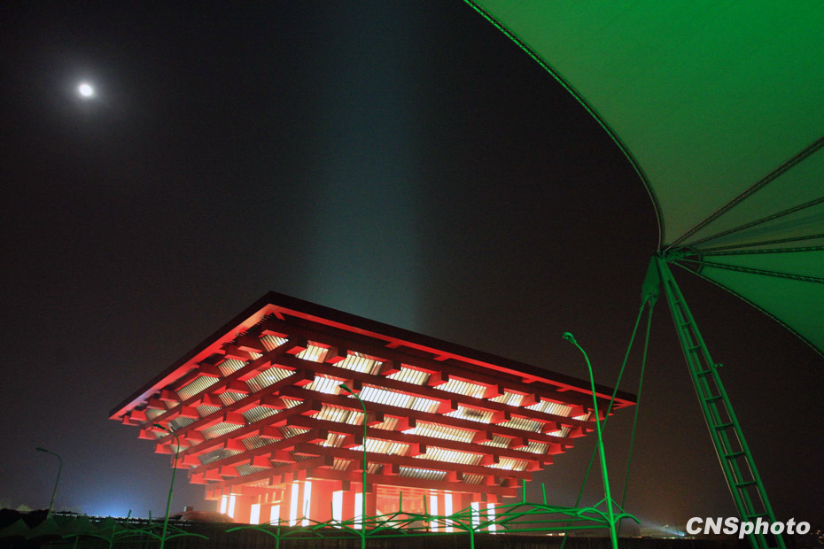 上海世博園“一軸四館”燈火通明,中國館、世博主題館,世博中心、陽光谷等同時(shí)亮燈。中新社發(fā) 潘索菲 攝