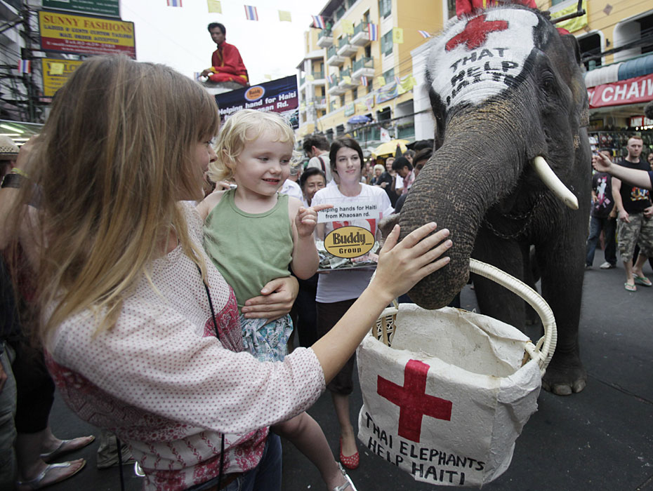 1月21日,在泰國(guó)首都曼谷舉辦了一場(chǎng)大象為海地災(zāi)區(qū)募捐活動(dòng)。人們紛紛向大象攜帶的籃子內(nèi)放入善款,向海地地震幸存者獻(xiàn)上一份愛心。圖片來源:中國(guó)新聞網(wǎng)