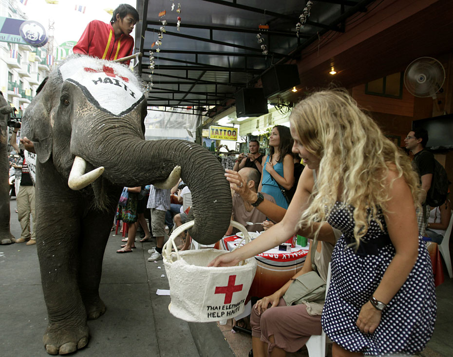 1月21日,在泰國首都曼谷舉辦了一場大象為海地災(zāi)區(qū)募捐活動。人們紛紛向大象攜帶的籃子內(nèi)放入善款,向海地地震幸存者獻(xiàn)上一份愛心。圖片來源:中國新聞網(wǎng)