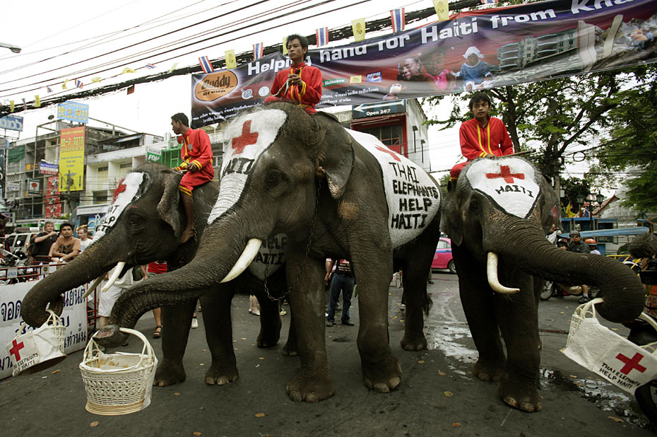 1月21日,在泰國(guó)首都曼谷舉辦了一場(chǎng)大象為海地災(zāi)區(qū)募捐活動(dòng)。人們紛紛向大象攜帶的籃子內(nèi)放入善款,向海地地震幸存者獻(xiàn)上一份愛心。圖片來(lái)源:中國(guó)新聞網(wǎng)