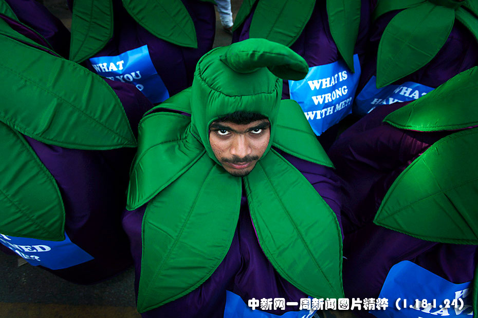 1月22日,印度班加羅爾綠色和平組織的活動者打扮成茄子抗議食用轉(zhuǎn)基因茄子。圖片來源:中國新聞網(wǎng)