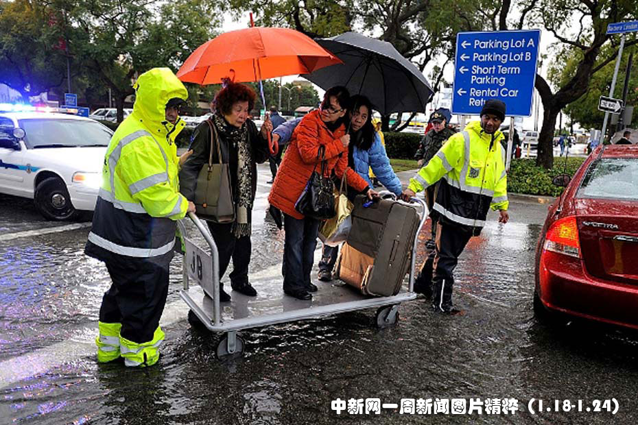 1月20日,在近期遭受暴風(fēng)雨襲擊的加州長灘地區(qū),捷藍(lán)航空公司工作人員幫助乘客穿過被水淹沒的機(jī)場停車場。圖片來源:中國新聞網(wǎng)