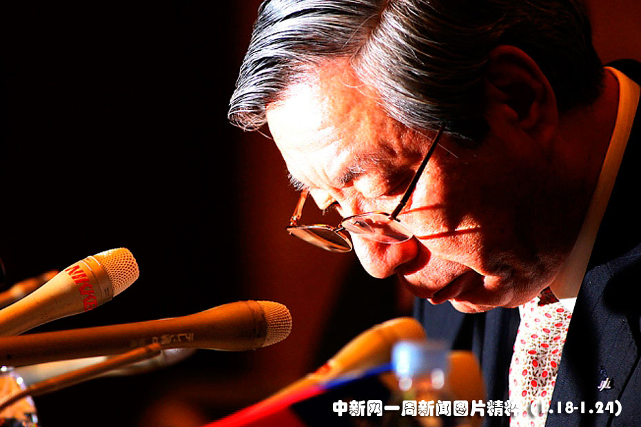 1月19日,負債256億美元的日本航空公司申請破產(chǎn)保護。圖為日航總裁西松遙當(dāng)天在東京為公司破產(chǎn)鞠躬致歉,并宣布辭職。圖片來源:中國新聞網(wǎng)