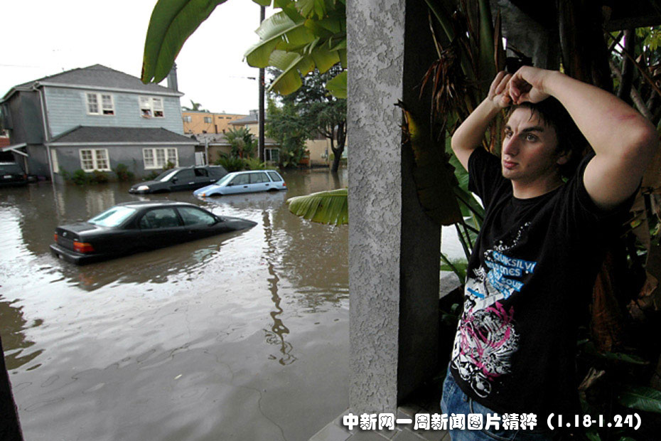 1月19日,羅杰斯在雨水涌進(jìn)家中之后在鄰居的門廊下躲避。因另一場(chǎng)太平洋暴風(fēng)雨在向美國(guó)南加州地區(qū)逼近,迫使數(shù)百名居民撤離。圖片來(lái)源:中國(guó)新聞網(wǎng)