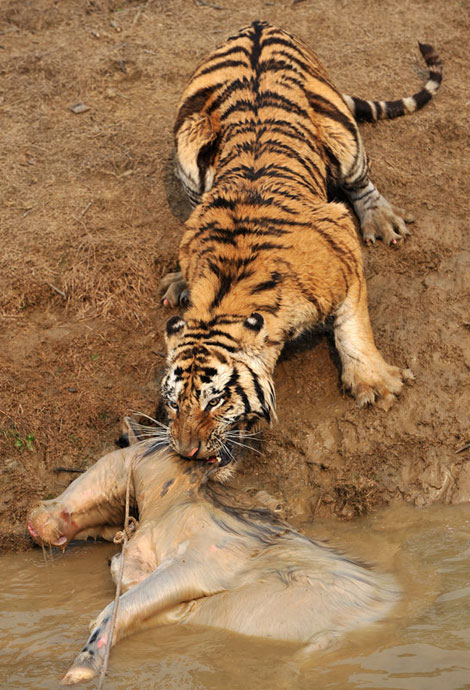 但水中的牦牛一動彈,更加激發(fā)了老虎的野性,這時(shí)有三、四只老虎撲了上來,工作人員拼命往水塘邊上拽牦牛,無奈一只虎王一下就咬住了牦牛的脖子怎么都不肯松口,繼而上演了人和老虎的“拔河比賽”。