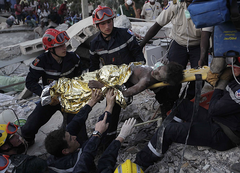 2010年1月27日,海地太子港,法國救援人員在一棟房屋的廢墟下救出被困15天的16歲女孩黛琳娜·艾提尼(Daline Etienne)。女孩微弱的話語讓大家著實吃驚:她竟是憑著隨身的可樂挺了過來。圖片來源:中國新聞網