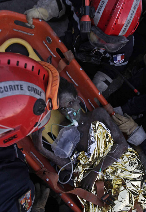 2010年1月27日,海地太子港,法國(guó)救援人員在一棟房屋的廢墟下救出被困15天的16歲女孩黛琳娜·艾提尼(Daline Etienne)。女孩微弱的話語(yǔ)讓大家著實(shí)吃驚:她竟是憑著隨身的可樂(lè)挺了過(guò)來(lái)。圖片來(lái)源:中國(guó)新聞網(wǎng)
