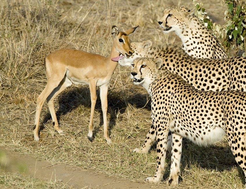 據(jù)英國媒體28日報道,一名在肯尼亞野生動物保護區(qū)拍照的攝影師拍到令人驚訝的畫面:三只獵豹與一只本是其獵物的小羚羊竟然和睦相處,共同嬉戲玩鬧,完全沒有危險“天敵”的概念。小羚羊最終毫發(fā)無傷地逃生成功。