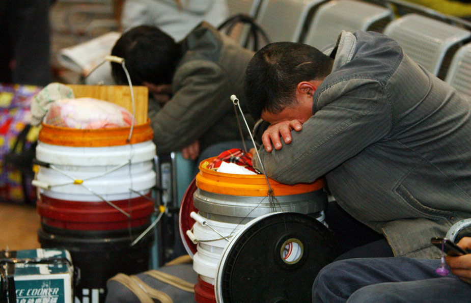 一年一度的春運(yùn)今日起正式開始。2010年的春運(yùn)從1月30日起至3月10日,為期40天,其中節(jié)前15天,節(jié)后25天。據(jù)權(quán)威預(yù)測(cè),今年春運(yùn)客運(yùn)量料超25億人次。圖為1月30日,幾名旅客在西安火車站候車大廳熟睡。 侯智 攝