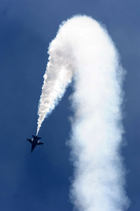 圖為美國F-16戰(zhàn)機(jī)在進(jìn)行飛行表演。