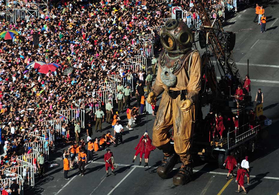 近日,智利首都圣地亞哥街頭,法國一劇團攜巨型提線木偶“小巨人”上街表演,它惟妙惟肖的表情和逼真的神態(tài)引得周圍觀眾的陣陣掌聲。圖片來源:中國新聞網(wǎng)