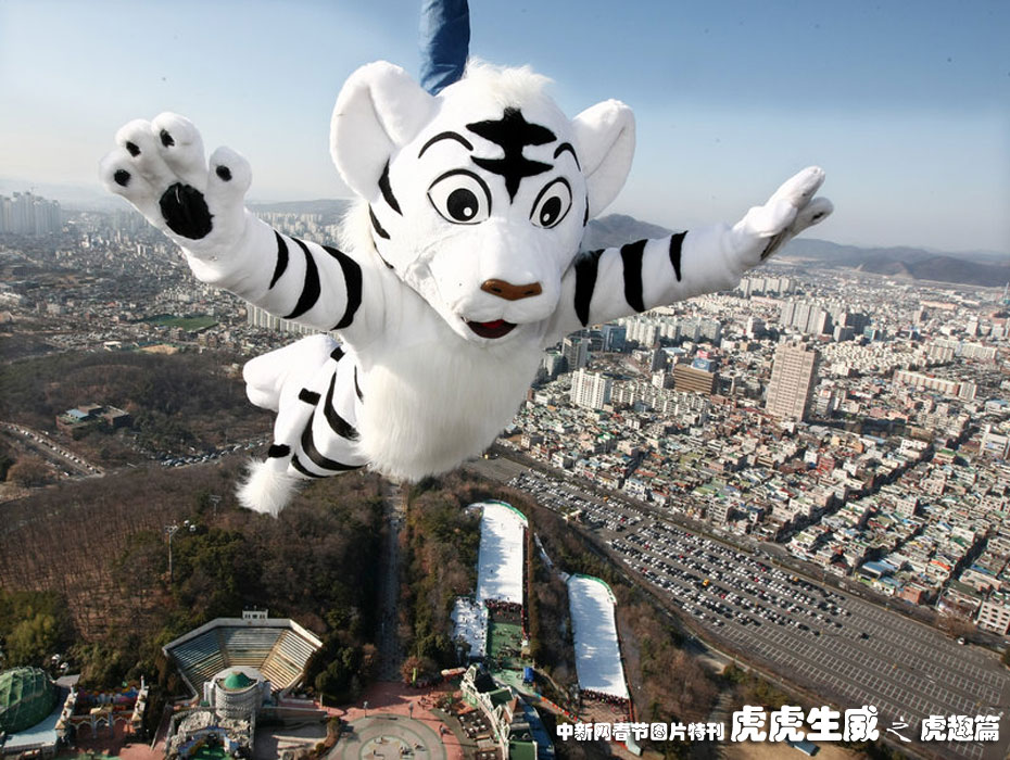 1月3日,為慶祝時(shí)隔60年迎來的白虎年,韓國(guó)大邱市民身穿白虎服裝跳蹦極,向人們致以新年的問候。圖片來源:CFP