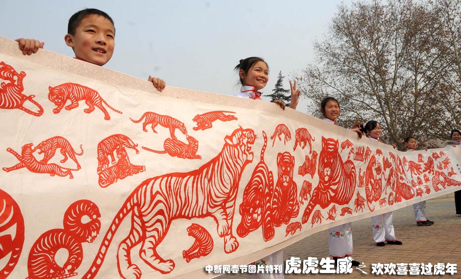 2月4日上午,洛陽(yáng)市中州西路小學(xué)師生展示10米民間剪紙長(zhǎng)卷《百虎爭(zhēng)春》圖。中新社發(fā) 張光輝. 攝