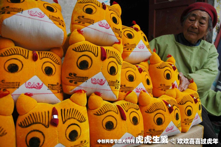 1月19日,河南省淮陽(yáng)縣民間老藝人馬玲賢與她制作的“布老虎”在一起。今年85歲的馬玲賢老太太制作“布老虎”已經(jīng)有近20年,她制作的“布老虎”工藝精良,造型天稚氣可愛。中新社發(fā) 楊正華 攝