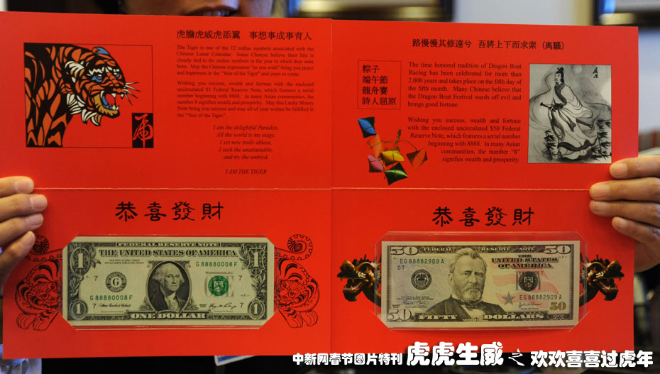 2009年12月1日,美國(guó)財(cái)政部造幣和印鈔局宣布,將限量發(fā)售中國(guó)虎年版“吉利錢”,向美國(guó)華裔社會(huì)送上新年祝福。中新社發(fā) 李靜 攝