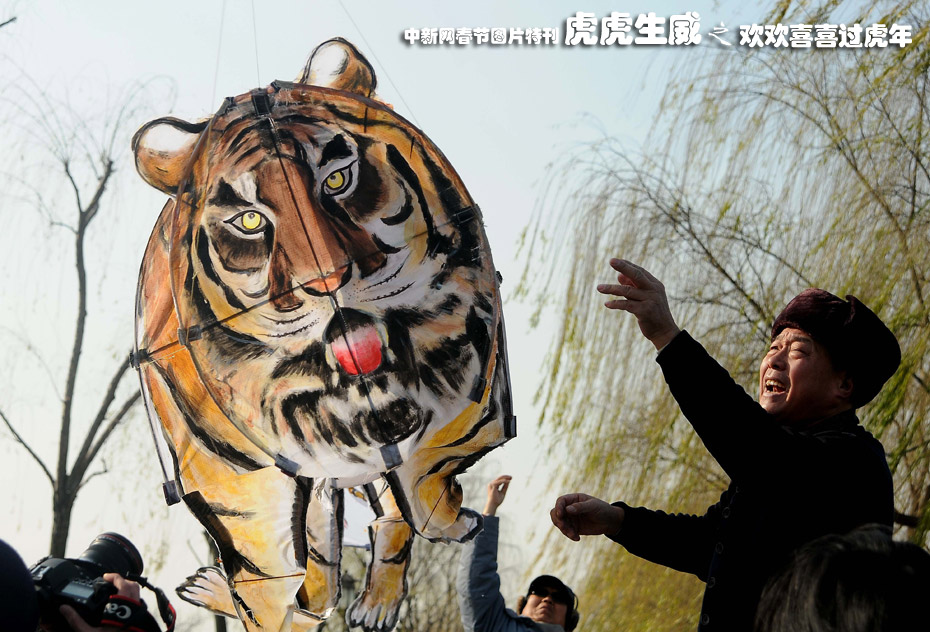 2009年12月31日,數(shù)位風(fēng)箏協(xié)會的主席、理事帶著他們制作的“猛虎下山”、“虎虎生威”等迎新風(fēng)箏來到杭州西湖白堤景區(qū)放飛,預(yù)祝協(xié)會和杭州市民來年紅紅火火。 中新社發(fā) 引煒 攝