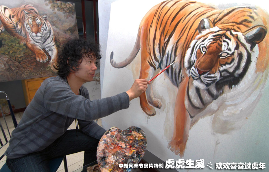 12月15日,遼寧省凌海市新莊子鄉(xiāng)禮中村的返鄉(xiāng)農(nóng)民工劉玉紅利用打工時學(xué)到的畫畫技藝,回鄉(xiāng)自主創(chuàng)業(yè)。他把中國畫傳統(tǒng)技法與油畫結(jié)合,創(chuàng)作一系列以“虎”為主題的作品,被不少國內(nèi)外美術(shù)愛好者收藏,成功實現(xiàn)再就業(yè)。中新社發(fā) 李鐵成jz 攝