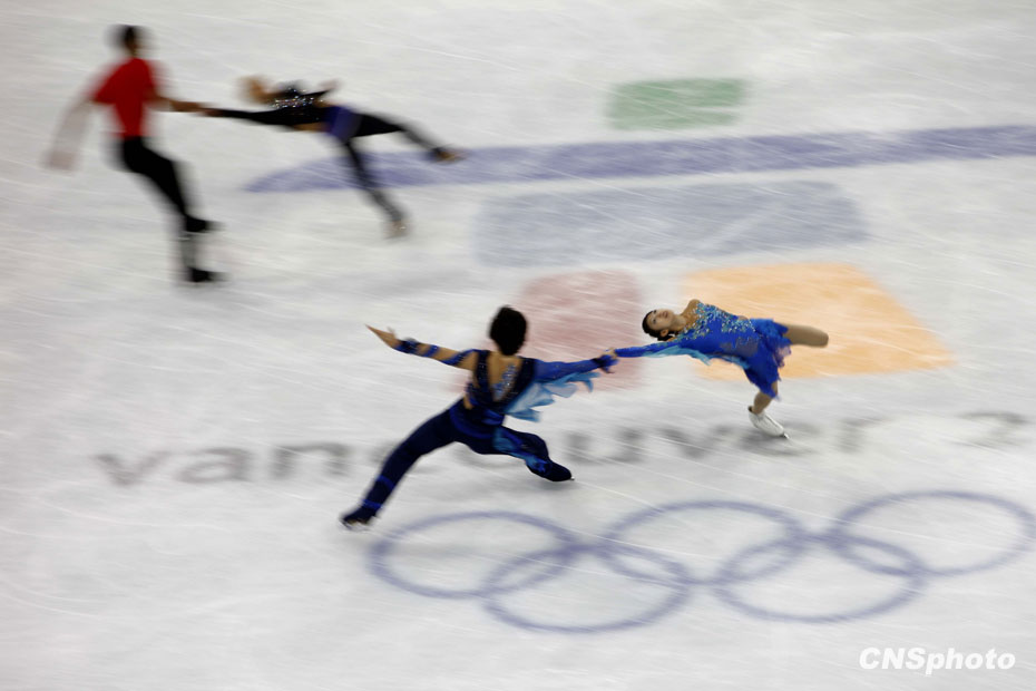 當(dāng)?shù)貢r(shí)間2月13日,中國(guó)花樣滑冰隊(duì)龐清/佟健、張丹/張昊在溫哥華太平洋體育館,利用最后的休息時(shí)間重復(fù)練習(xí)積極備戰(zhàn)即將到來(lái)的比賽。中新社記者 盛佳鵬 攝