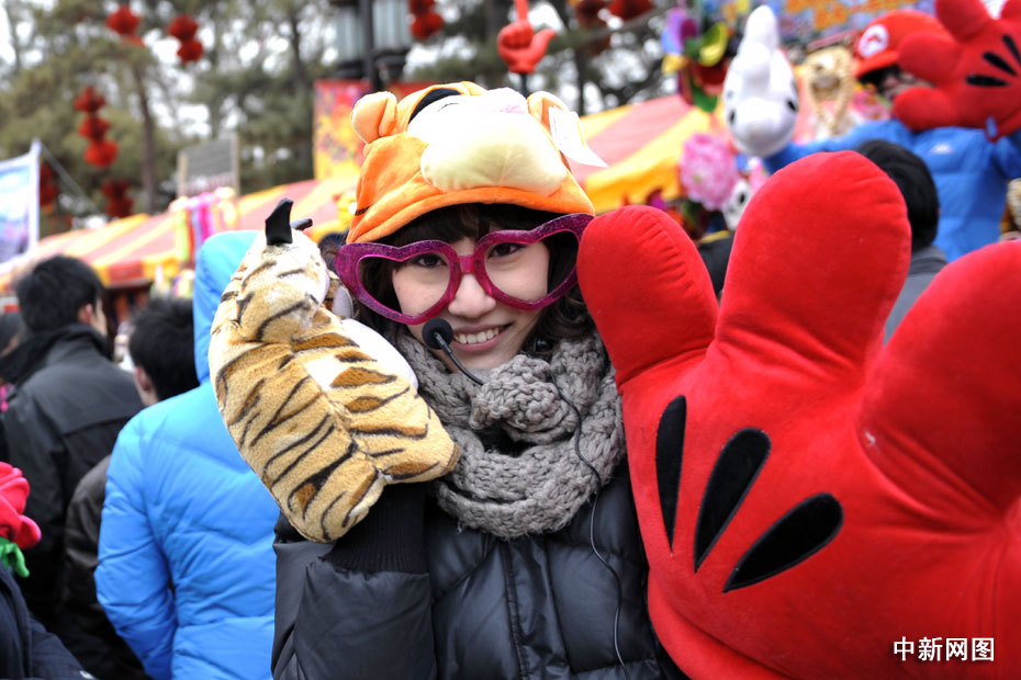 2月14日,農(nóng)歷正月初一,北京各大傳統(tǒng)廟會、洋廟會爭相開幕,許多游客頭戴虎年飾品開心游廟會。中新網(wǎng)記者 金碩 攝