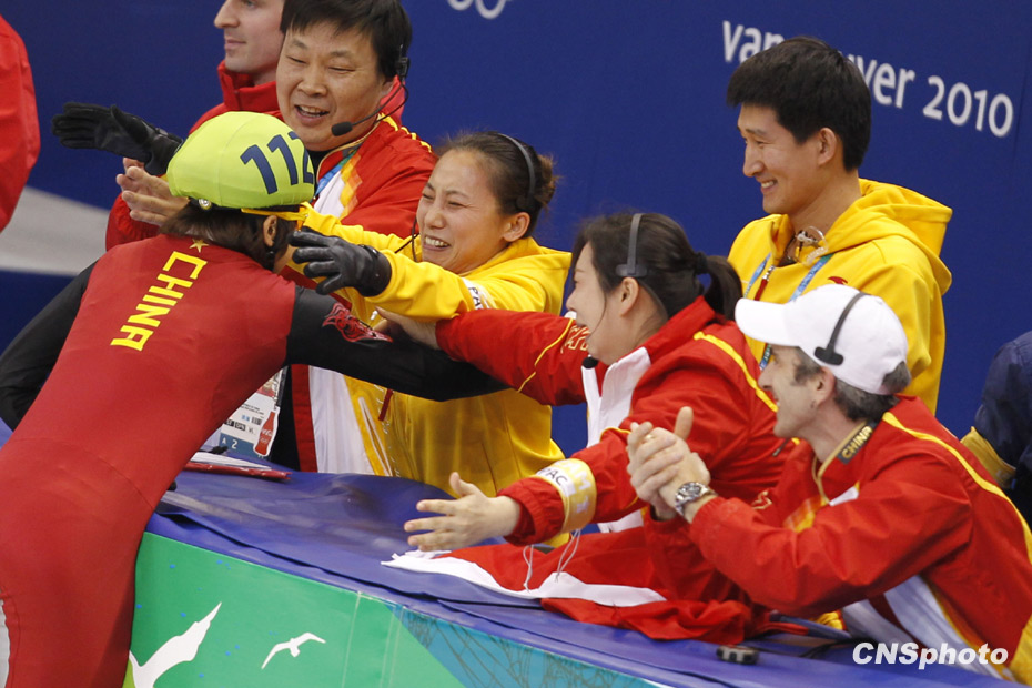 2010年溫哥華冬奧會短道速滑女子500米決賽北京時間2月18日上午11時許舉行,中國選手王濛獲得冠軍,為中國代表團再添一枚金牌。圖為王濛與教練和隊友擁抱。中新社發(fā) 盛佳鵬 攝 圖片來源:中國新聞網(wǎng)