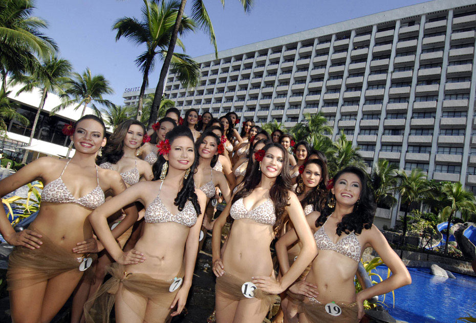 2月18日,在菲律賓首都馬尼拉,參加2010年菲律賓小姐競選的選手們在展示泳裝。當(dāng)日,共有24名佳麗參加了這項比賽。圖片來源:中國新聞網(wǎng)