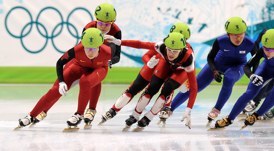 當(dāng)?shù)貢r(shí)間2月24日,溫哥華冬奧會(huì)女子短道速滑3000米接力A組決賽中,中國(guó)隊(duì)王濛、周洋、孫琳琳、張會(huì)四朵金花聯(lián)袂出擊,最終將金牌歸入中國(guó)隊(duì)囊中。圖片來源:中國(guó)新聞網(wǎng)